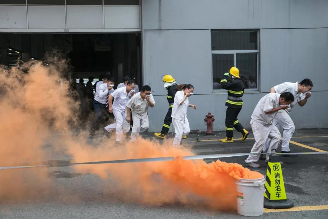 消防安全知識培訓結束后,相關人員來到模擬火災發生點。隨著警報聲的拉響,實操演練正式拉開帷幕。相關人員在總指揮——廣汽豐田總經理王祖安的帶領下,有序撤離火災現場。