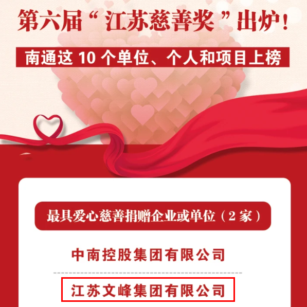 9月5日,江蘇省政府召開“江蘇慈善獎(jiǎng)” 表彰大會(huì),隆重表彰第六屆“江蘇慈善獎(jiǎng)”獲獎(jiǎng)單位和人員。江蘇文峰集團(tuán)有限公司憑借長期以來在公益慈善領(lǐng)域的貢獻(xiàn),被評(píng)為了“最具愛心慈善捐贈(zèng)企業(yè)”。