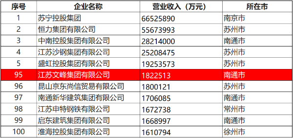 9月21日,江蘇省工商業(yè)聯(lián)合會(huì)發(fā)布了“2020江蘇省民營(yíng)企業(yè)百?gòu)?qiáng)”榜單。江蘇文峰集團(tuán)以182.25億元的營(yíng)業(yè)收入,名列“2020江蘇省民營(yíng)企業(yè)百?gòu)?qiáng)”第95位。