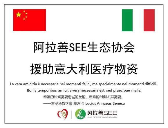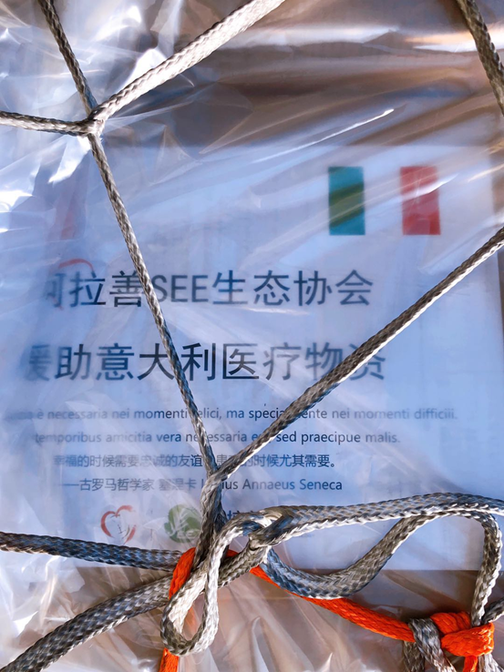 “幸福的時候需要忠誠的友誼,患難的時刻尤其如此”,這句古羅馬哲學家塞涅卡的名言,也特意印制在了此次阿拉善SEE捐助意大利的醫療物資包裝上。值得一提的是,這名言的意大利語和拉丁語校對的志愿者Daniela,也來自意大利,是“阿拉善SEE志愿者”體系注冊的411號志愿者。